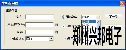 首先選擇好電腦的通訊端口,填寫產(chǎn)品的序列號一般出廠默認設(shè)置是0000,然后為設(shè)備起個名稱,選擇好所控制門的類型,最后點擊下一步,接著會彈出如圖七所示對話框。