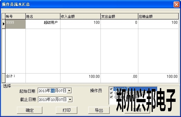 4.查詢操作員賬戶匯總是在操作員流水匯總表中,可根據日期查詢到收入、支出及應繳的金額。