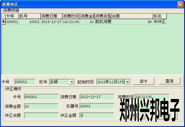 3. 點卡管理--消費沖正,此時把多消費的那張卡放到讀卡器上,然后點讀卡,此時會出現這天這張卡所有的消費記錄,找到消費多扣的那筆記錄,然后雙擊那筆記錄,此時下面就會出現這筆記錄的信息,然后把多消費的金額在沖正金額那輸入即可。(如我這筆消費記錄應該是8元,但是按錯了按成10元,此時我可以沖正2元)