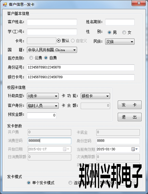 單個發卡是現將基本信息填寫完成后將卡片放在讀卡器上直接進行發卡。有單個發卡模式和連續發卡模式兩種發卡模式。