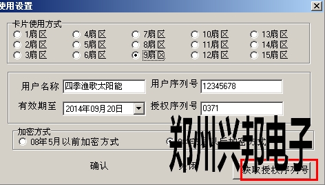 2.雙擊后出現(xiàn)下圖所示的界面,點(diǎn)擊該界面右下角的【獲取授權(quán)序列號】按鈕,即可讀出當(dāng)前數(shù)據(jù)庫中的設(shè)置,包括 使用扇區(qū)、用戶名稱、用戶序列號、授權(quán)序列號、加密方式